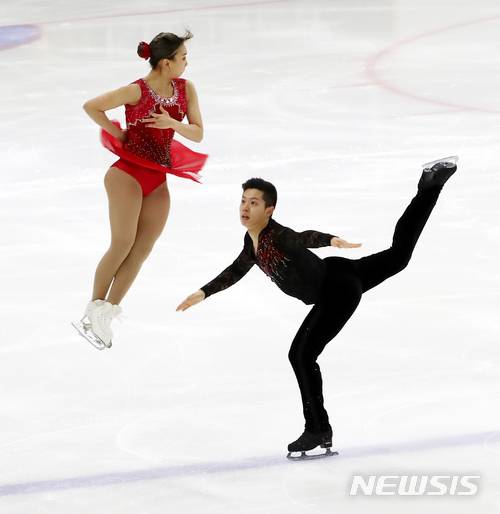 【서울=뉴시스】박주성 기자 = 5일 오후 서울 목동실내빙상장에서 열린 제72회 전국남녀 피겨스케이팅 종합 선수권대회 겸 평창올림픽 피겨 국가대표 3차 선발전에서 시니어 페어스케이팅 김강찬-김규은 선수가 경기를 펼치고 있다. 2018.01.05.