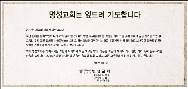 | ▲ 명성교회가 1월1일 낸 사과문. 이 사과문은 세습 반대하는 쪽으로부터 진정성이 없다는 비판을 받고 있다. |