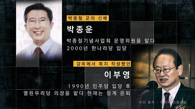 박종철 군의 선배 박종운 씨는 '박종철기념사업회' 운영위원을 지낸 뒤 2000년 한나라당에 입당했습니다. 박 씨는 이후 16대와 17대, 18대 국회의원 선거에 출마했지만 모두 낙선했습니다. 박종철 고문치사 사건의 진실을 알리기 위해 감옥에서 쪽지를 작성했던 이부영 씨는 1990년 민주당에 입당하며 정계에 입문했고 이후 열린우리당 의장을 지냈으나 현재는 정계에서 은퇴했습니다.