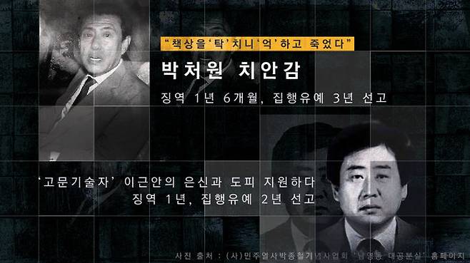 영화 속에서 박종철 고문치사 사건을 주도적으로 은폐하려 했던 박처원 치안감은 "책상을 '탁' 치니 '억' 하고 죽었다"는 말을 남긴 것으로 유명합니다. 그는 실존 인물로 고문사건을 은폐하도록 지시한 혐의로 구속됐지만 1996년 대법원에서 징역 1년 6개월에 집행유예 3년을 선고받았습니다. 이후 박처원 치안감은 박종철 고문치사 사건에 대해 어떤 사과도 하지 않았고 '고문기술자' 이근안 씨의 은신과 도피를 지원했다가 2000년 징역 1년에 집행유예 2년을 선고받았습니다.