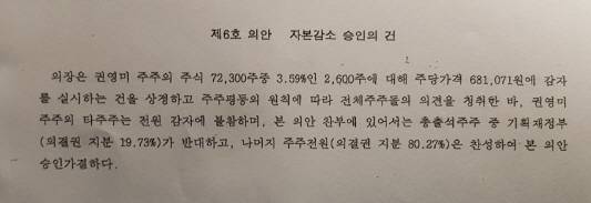 기재부가 보유한 기업 주식을 관리하고 있는 한국자산관리공사(캠코)가 국회 정무위원회 소속 심상정 정의당 의원에 제출한 ‘주주총회 의사록(2012.3)’을 살펴보면 2012년 주총 당시 다스는 제6호 자본감소 승인의 건에 권씨만 유일하게 참여하는 유상감자 안건을 상정한다. 기재부는 유상감자에 반대했지만 지분 80.27%를 보유한 나머지 주주들의 찬성하면서 안건이 가결됐다. 다스는 이듬해 3월 열린 주총에서 유상감자로 발생한 자본 감소분을 이익잉여금으로 충당했다. 2012년 기준 다스가 쌓아놓은 이익잉여금은 1723억원에 달했다.