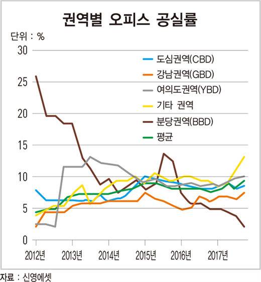 종로와 을지로 일대 도심권역(CBD)과 테헤란로 및 강남대로를 중심으로 한 강남권역(GBD)의 공실률은 각각 8.6%, 7.4%다. 여의도와 마포구 일대인 여의도권역(YBD)의 공실률은 10.1%로 분당권역 공실률의 4~5배에 가깝다.