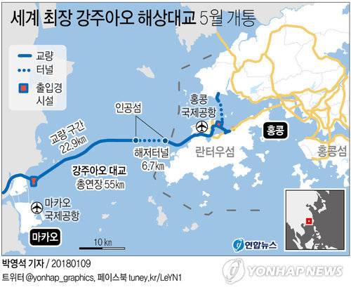 (서울=연합뉴스) 박영석 기자 = 중국 홍콩과 광둥(廣東)성 주하이(珠海), 마카오를 잇는 세계 최장 해상대교인 강주아오(港珠澳) 대교가 오는 5월이나 6월 개통한다고 홍콩 명보와 중국일보가 9일 보도했다.