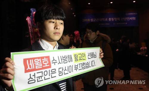 (서울=연합뉴스) 최재구 기자 = 10일 서울 강남구 역삼동에서 열린 성균관대학교 총동창회에서 성균관대 재학생들이 황교안 전 총리의 자랑스러운 성균인상 수상에 반대하며 피켓 시위를 벌이고 있다. 2018.1.10