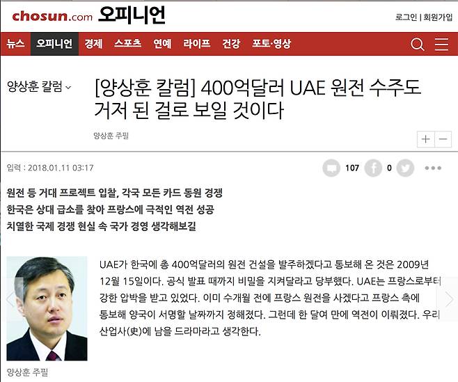 | ▲ <조선일보> 양상훈 주필은 11일치 칼럼에서 UAE 원전 수출의 정당성을 강변했다. |