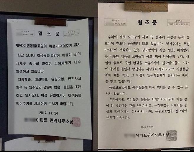 이 관리사무소는 지난해 11월 "차량 훼손, 배관 훼손, 환경오염, 안전사고 발생 등으로 입주민 생활에 많은 불편을 초래한다"며 "야생동물 먹이 주기를 자제해 주기를 바란다"는 내용의 협조문을 게시했습니다.