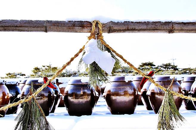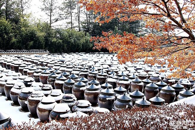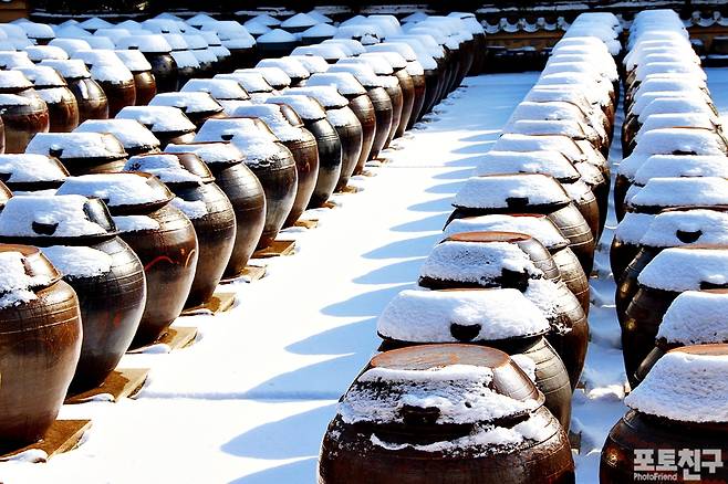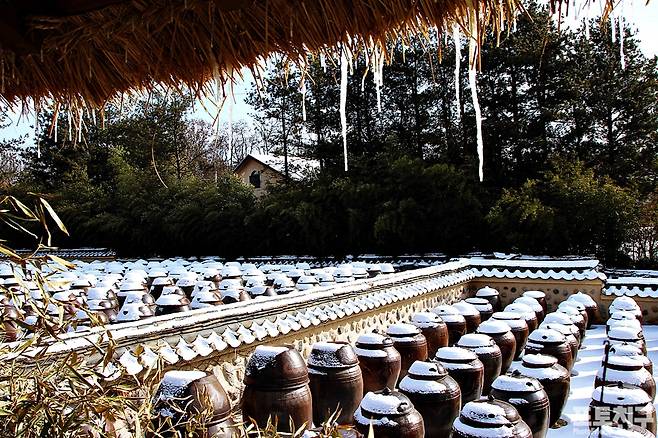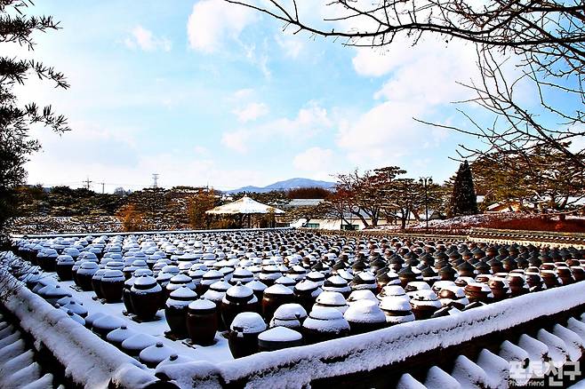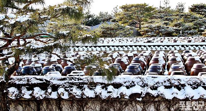 하얀 눈이 항아리들을 감싸 않은 모습이 이채롭습니다.