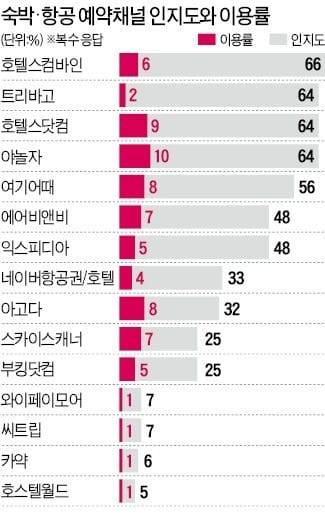 이번 조사는 지난해 여행 경험이 있는 성인 남녀 6534명을 대상으로 숙박·항공 예약 채널 인지도와 이용 횟수를 조사했다. 평가 대상은 부킹닷컴과 스카이스캐너, 씨트립, 아고다, 에어비앤비, 와이페이모어, 익스피디아, 카약, 트리바고, 호텔스닷컴, 호텔스컴바인, 여기어때, 야놀자, 네이버 항공권·호텔, 호스텔월드 등 국내외 숙박·항공 예약 채널 15곳이었다.
