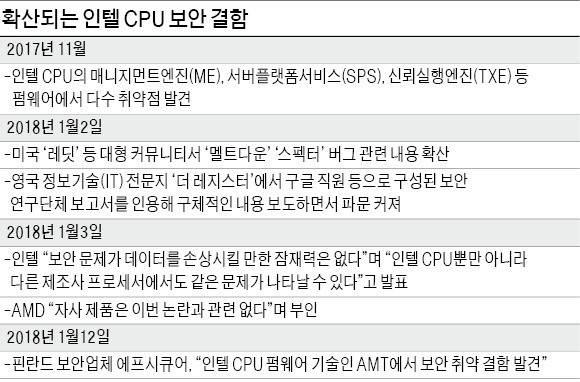 '멜트다운' '스펙터' 등 이달 초 인텔 CPU 칩의 보안 결함이 불거진 지 얼마 지나지 않아 또 다른 취약점이 드러나면서 인텔 CPU 체제의 신뢰성이 상당한 타격을 입을 전망이다.