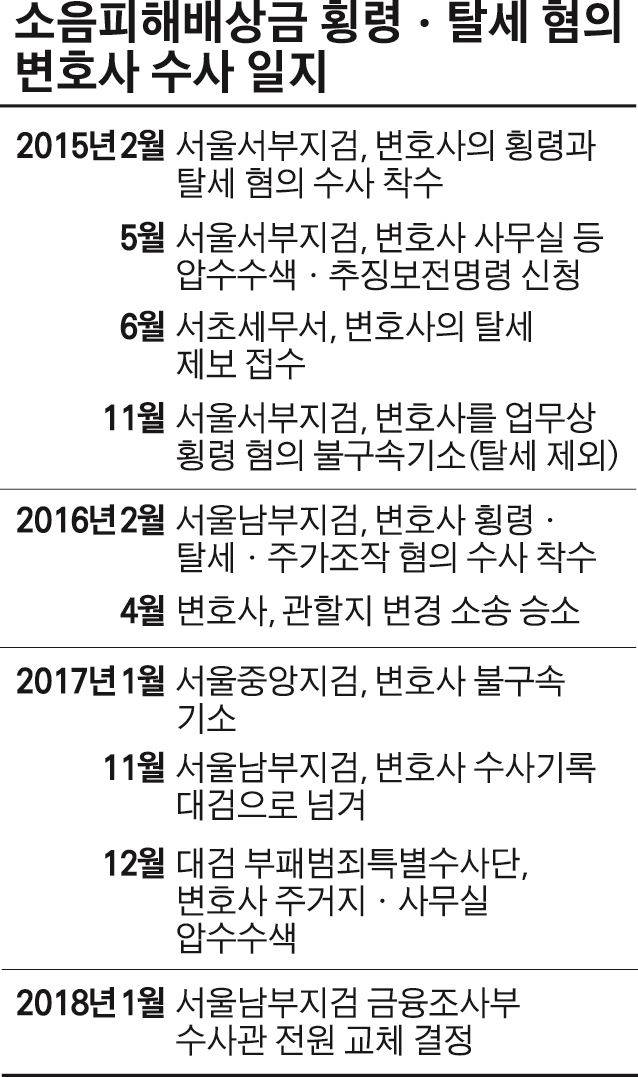 14일 한국일보 취재 결과, 서울서부지검은 2015년 초 집단소송을 통해 거액을 벌어들인 최모(57) 변호사의 횡령과 탈세 정황을 포착하고 수사에 착수했다. 피해자들에게 돌아가야 할 지연이자 수백억원을 가로채 주식투자 등에 썼고, 이 과정에서 거액을 탈세한 단서가 드러났기 때문. 수사검사는 최 변호사 사무실 등을 압수수색하고 법원에 최 변호사 예금 등에 대해 추징보전명령 청구까지 하는 등 의욕이 넘쳤다. 구속영장 청구 방안도 검토했다. 그러나 윗선의 영향 때문인지 영장은 청구되지 않았고, 기소할 때도 탈세 혐의는 통째로 빠졌다.