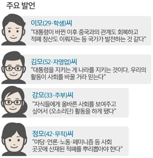 “적폐 청산 등 사회 변화를 해야 하기 때문”이란 응답이 7명으로 가장 많았다. 대학생 이모(29)씨는 “지지도가 70%를 넘는 것을 보면 대통령이 잘하고 있는 게 아니겠느냐”며 “문 대통령 취임 후 적폐 청산도 이뤄지고 있어 국가가 발전하는 것 같다”고 평가했다. 주부 강모(33)씨는 “자식들에게 올바른 사회를 보여주고 싶어서 (오소리단) 활동을 한다”며 “상대적으로 시간이 있는 낮에 커뮤니티나 기사에 대통령을 지지하는 댓글을 단다”고 설명했다.