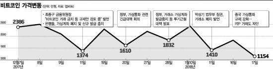 정부 대응이 본격화하면서 과열된 가상통화 가격이 하락세로 접어들었다.