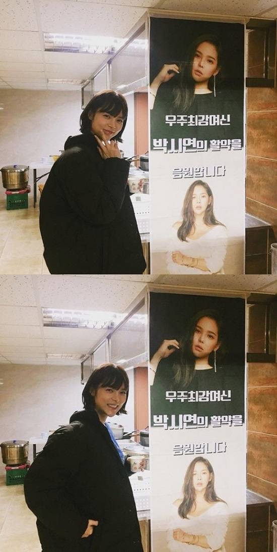 공개된 사진 속 박시연은 '우주최강여신 박시연의 활약을 응원합니다'라고 적힌 현수막 앞에서 포즈를 취하고 있는 모습. 최근 단발머리로 변신한 박시연은 여전히 눈부신 미모를 자랑하며 눈길을 사로잡았다.