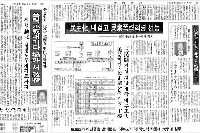 | ▲ 1985년 10월 29일 서울대 민추위 사건에 대한 검찰의 수사결과를 보도한 경향신문. 이 사건의 배후가 민청련과 김근태 의장라는 검찰 발표를 그대로 베껴 쓰고 있다. 이 사건을 담당한 최환 공안검사의 인터뷰도 실려 있다. 2017년 개봉된 영화 [1987]에서 그는 박종철 고문사를 밝힌 의로운 영웅으로 묘사됐지만, 1985년의 그는 권력에 복종하는 다른 공안 검사와 다를 바 없는 인물이었다. |