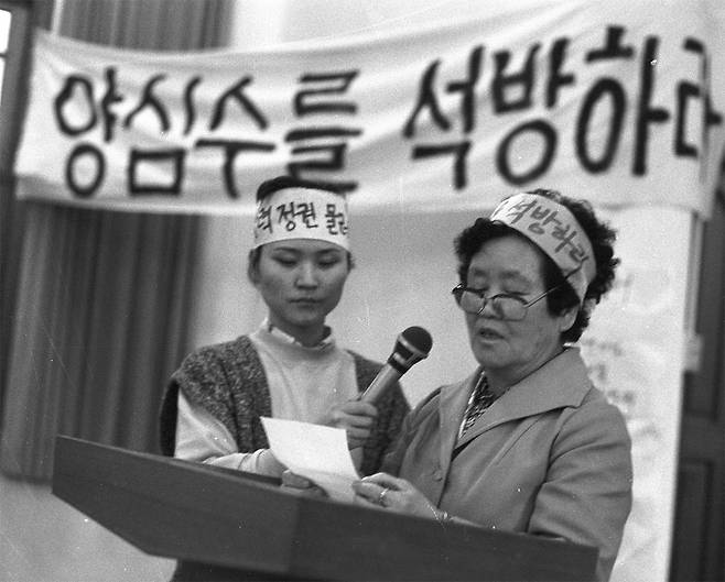| ▲ 전민학련 사건의 이태복 모친 이정숙 여사(오른쪽)와 민가협 문양을 디자인한 이기연(왼쪽). 1986년 민가협 집회에서. |