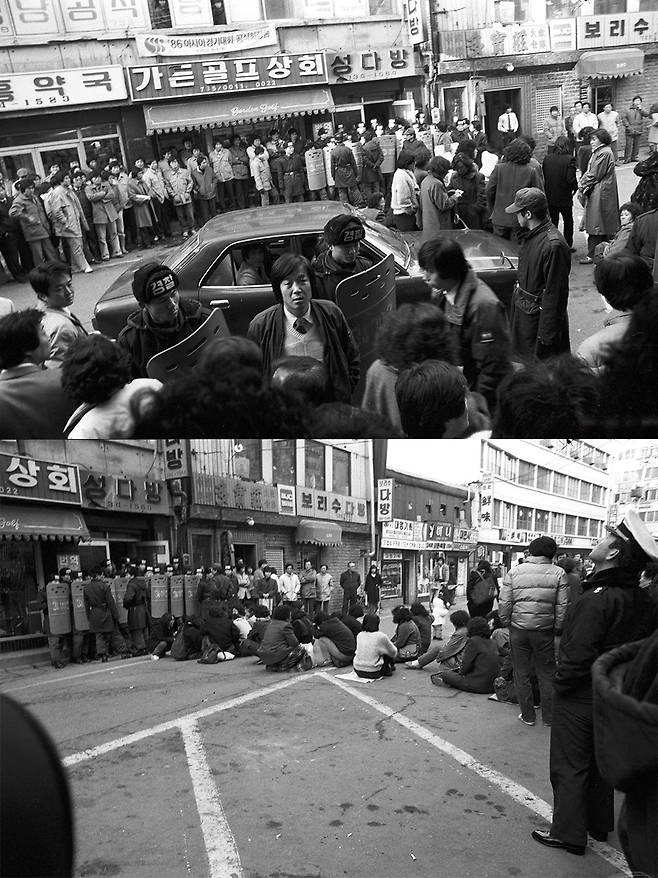 | ▲ 1985년 12월 18일 민가협 현판식을 막아서는 경찰(위)과 사무실이 있는 거리 앞에서 농성중인 민가협 회원들(아래) |