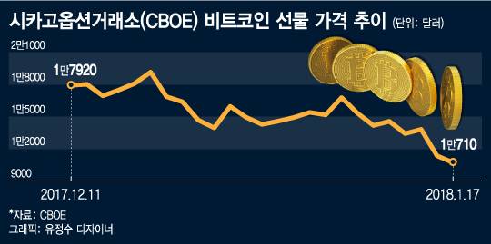 하지만 1월 인도분 선물 청산일인 17일를 앞두고 비트코인 가격은 급락하기 시작했다. 16일 코인베이스에서 비트코인 가격은 한때 9969달러까지 떨어졌다. 지난해 12월 17일 기록한 사상 최고가 대비 '반토막' 수준이다. 비트코인 가격이 1만 달러 밑으로 떨어진 건 지난해 11월 말 1만 달러를 돌파한 이후 처음이다.