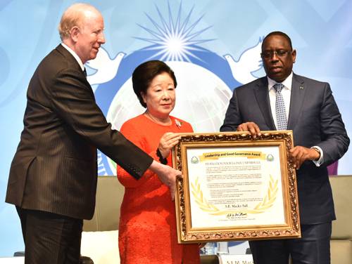 이어 등단한 마키 살 세네갈 대통령은 “한 총재께서 아프리카까지 오셔서 수백년 동안 아픔과 어려움을 겪어온 아프리카 대륙에 희망의 말씀을 주셨다. 이제 아프리카는 미래의 대륙이고 그 미래가 바로 오늘부터 시작된다”고 말했다. 마키 살 대통령은 이어 “한 총재가 기부하신 굿 거버넌스 상금 10만달러는 기아 문제를 해결하기 위해 고아원에 기부하고, 개발을 통해 새로운 평화를 만들어 나갈 것”이라고 강조했다.