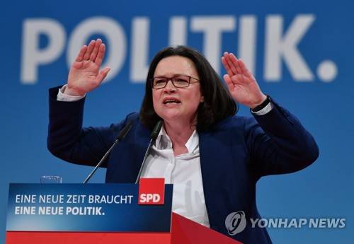 epa06461004 Andrea Nahles, the parliamentary group leader of the Social Democratic Party (SPD), speaks during the extraordinary federal party convention of the German Social Democratic Party (SPD) in Bonn, Germany, 21 January 2018. Some 600 delegates and 45 board members of the SPD will discuss and decide whether or not to start coalition negotiations with the conservative Christian Democratic Union (CDU) and Christian Social Union (CSU) parties to form another so-called 'Grand Coalition' (Grosse Koalition, or GroKo) government on the basis of the recent on the basis of the exploratory talks. It is expected that SPD leader Martin Schulz will face some criticism from the party's basis and demands to amend the SPD's catalogue of requirements. EPA/SASCHA STEINBACH