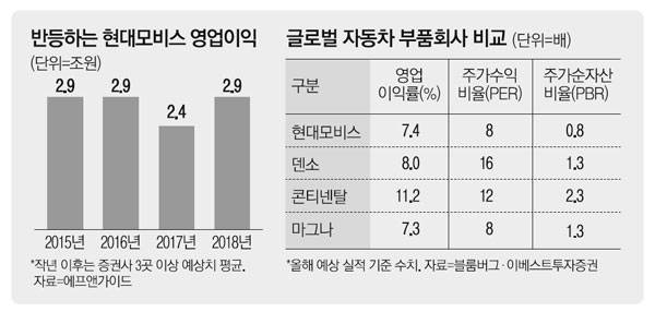 현대모비스는 주식시장에서 일본 덴소, 독일 콘티넨탈과 곧잘 비교된다. 블룸버그와 이베스트투자증권에 따르면 올해 현대모비스 예상 실적 기준 주가수익비율(PER)은 8배로 덴소(16배)나 콘티넨탈(12배)에 비해 저평가돼 있다. 주가순자산비율(PBR)로 보면 글로벌 부품사들이 1~2배 수준으로 평가받는데 현대모비스는 0.8배에 그쳐 청산 가치에도 못 미치고 있다. 중국 사드 악재로 낮아진 주가 수준, 자율주행차 관련 그룹 지원을 받는 높은 성장성이 부각되며 외국인들은 꾸준히 지분율을 높여왔다. 지난 19일 기준 현대모비스 외국인 지분율은 48.1%로 현대차(45.9%)와 기아차(37.8%)보다 높다.