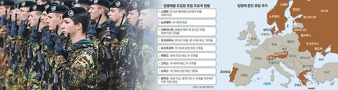 냉전이 끝난 1990년대 이후 유럽에서는 징병제 폐지가 대세였다. 2013년까지 전체 44개 유럽 국가 중 24개국이 모병제로 전환했다. 그러나 우크라이나가 2014년, 리투아니아가 2015년 징병제를 재도입하면서 역사 속으로 사라지는 듯했던 징병제는 다시 살아났다. 노르웨이도 2013년 법 개정을 통해 2016년 7월부터 남녀 모두를 대상으로 징병제를 실시했다. 2010년 모병제로 전환했던 스웨덴도 지난해 3월 징병제를 재도입하기로 결정하고 지난 1일부터 18세 이상 남녀를 대상으로 의무 복무제 시행에 들어갔다.