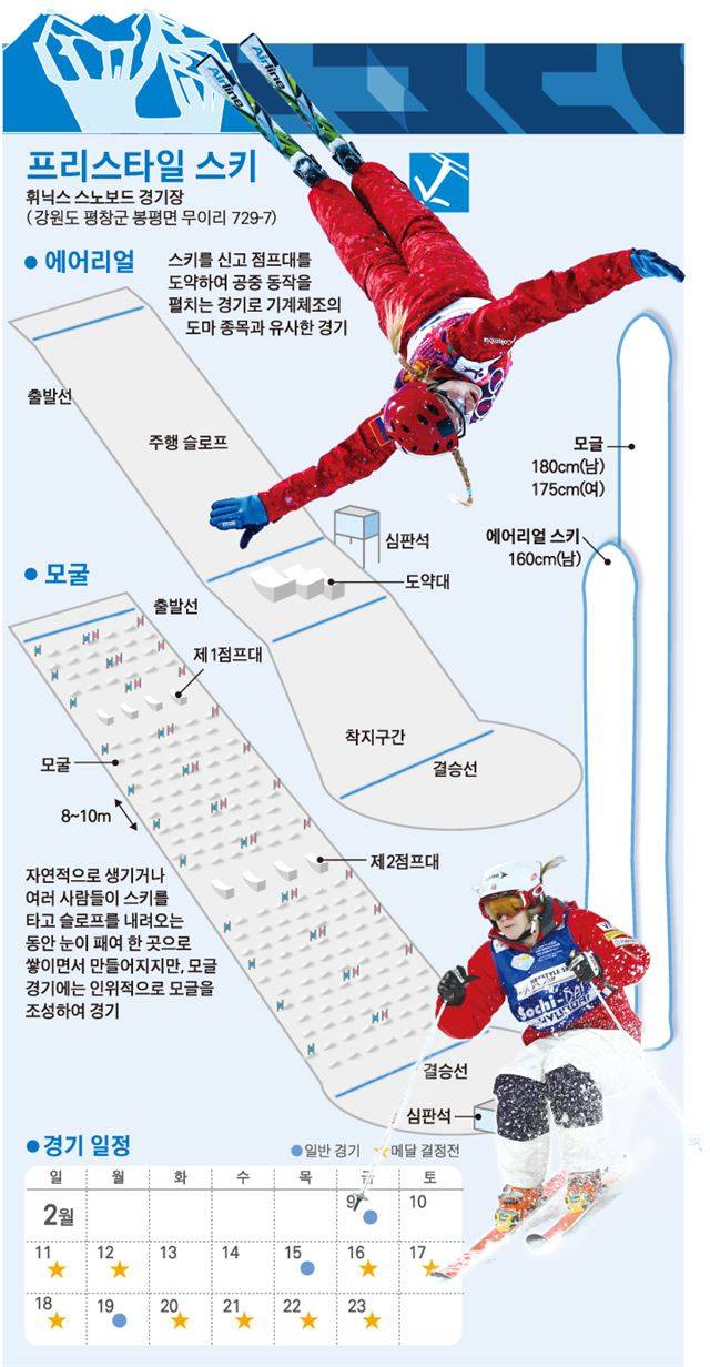동계 스포츠 중 가장 다양한 만큼 경기 일정도 2월 9일 남녀 모굴스키 예선을 시작으로 23일 여자 스키크로스 결승까지 평창 올림픽 기간 대부분에 걸쳐 진행된다.