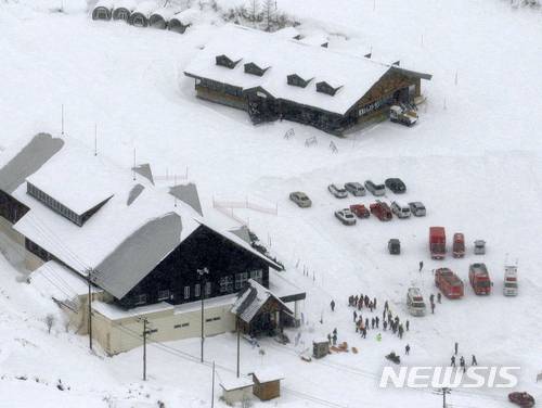 【구사쓰=교도통신·AP/뉴시스】일본 군마현 구사쓰에 있는 구사쓰시라네 화산이 23일 폭발하면서 인근 스키리조트에서 눈사태가 발생했다.사진은 눈사태 현장에 소방차와 앰뷸런스 등이 출동해 있는 모습. 2018.1.23