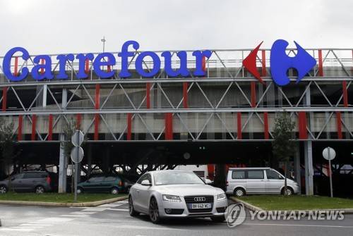 A car leaves a Carrefour supermarket in Anglet, southwestern France, Tuesday, Jan.23, 2018. French retailer Carrefour says it will invest 2.8 billion euros ($3.4 billion) over the next five years in online shopping as part of a plan to boost growth that will also result in 2,400 job cuts. (AP Photo/Bob Edme)