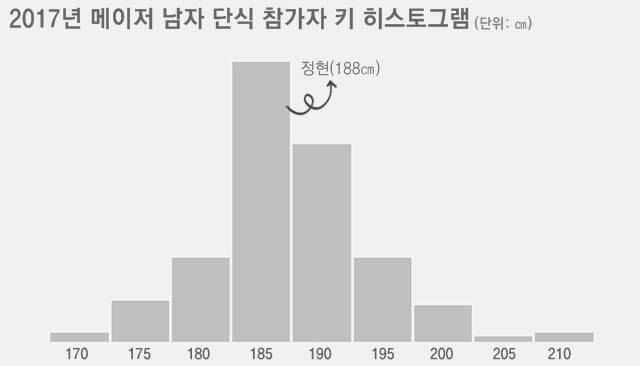 ATP 프로필에 자기 키를 188㎝라고 밝힌 정현은 평균보다 큽니다. 또 지난해 4대 메이저 단식에 참가한 선수 키 분포를 보여주는 히스토그램을 보면 정현이 속한 185~190㎝ 구간에 가장 많은 선수가 속해 있다는 걸 알 수 있습니다.