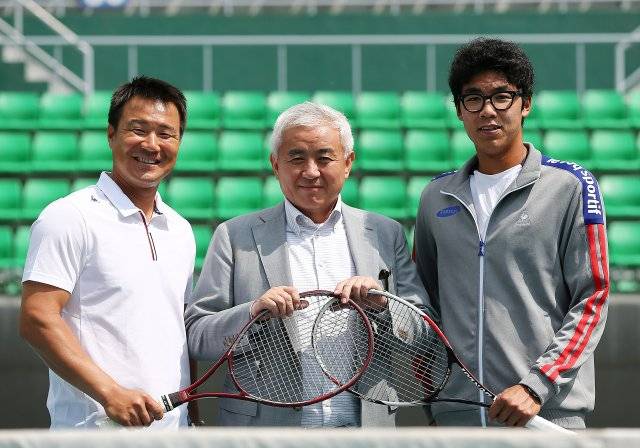 | 이형택(왼쪽)과 정현(오른쪽)의 키 차이를 느껴 보세요. 가운데는 주원홍 전 대한테니스협회장. 전영한 기자 scoopjyh@donga.com |