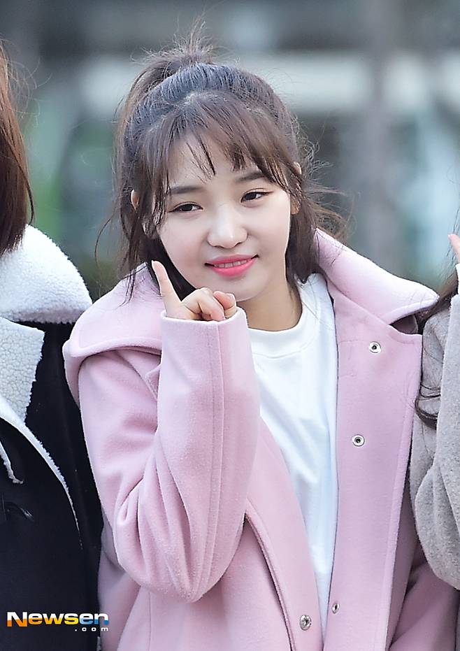 이날 프로미스나인(노지선, 송하영, 이새롬, 이채영, 이나경, 박지원, 이서연, 백지헌, 장규리) 노지선이 출근하고 있다.