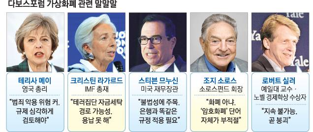 세계 각국의 정치·경제 지도자들이 모인 스위스 세계경제포럼(WEF·다보스포럼)에서도 비트코인으로 대표되는 가상화폐에 관심이 집중됐다. 이들은 가상화폐의 미래를 진단하면서 문제점을 비판하고 규제 가능성을 시사하는 목소리를 냈다.