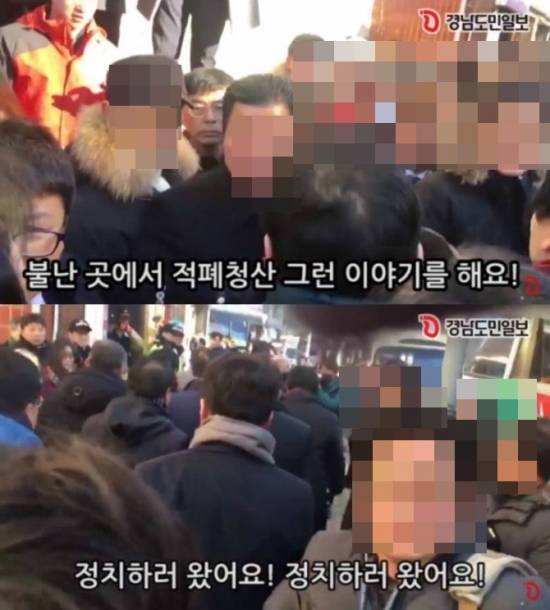 이에 현장에 있던 한 시민은 “아니 의원님, 지금 불난 집에 와서 무슨 그런 말을 하느냐. 불난 곳에서 적폐청산을 얘기 하냐”며 항의했다. 다른 시민들은 김 원내대표를 향해 “정치하러 왔어요. 정치하러 왔어요”라며 소리치기도 했다.