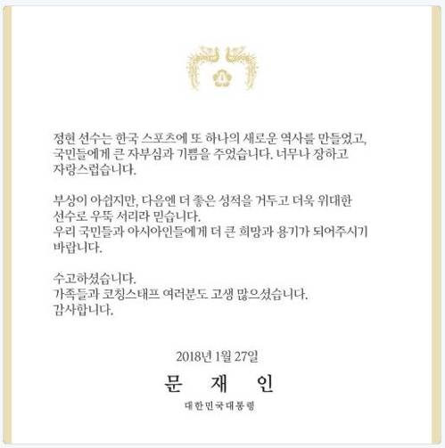그러면서 "부상이 아쉽지만, 다음엔 더 좋은 성적을 거두고 더욱 위대한 선수로 우뚝 서리라 믿는다"며 "우리 국민과 아시아인들에게 더 큰 희망과 용기가 되어 주기 바란다"고 당부했다.