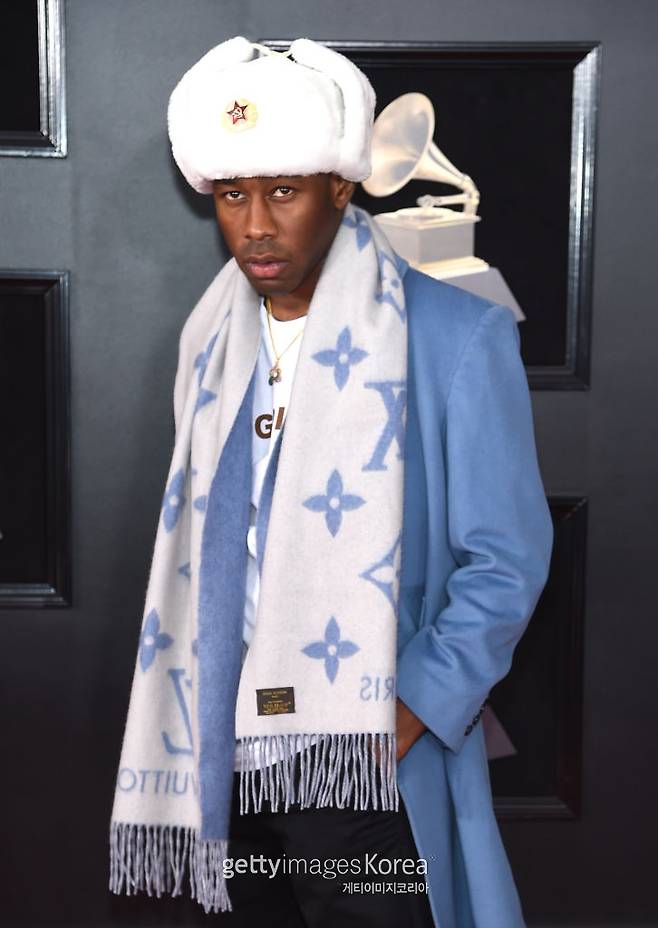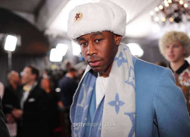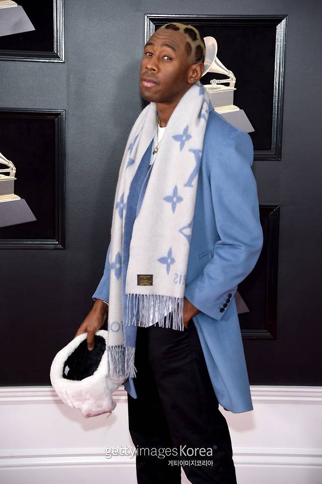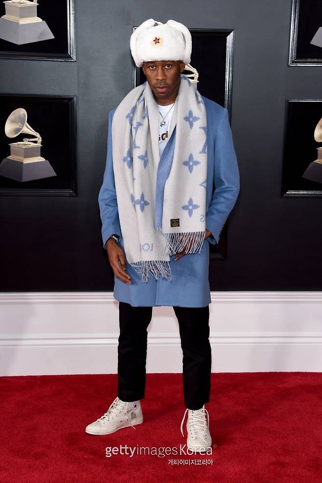 타일러 더 크리에이터는 파스텔 하늘색과 화이트로 톤을 맞췄다. 털모자와 목도리까지 고급스럽게 착용하며 겨울 패션을 완성했다. 취재진의 요청에 모자를 벗은 그는 환한 미소를 지었다. 표범을 연상케하는 염색헤어와 개구진 표정이 인상적이다.