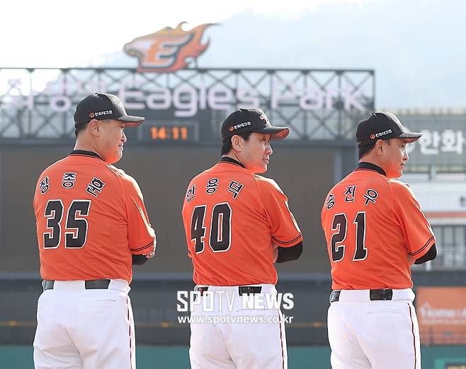 [포토S] 장종훈-송진우 코치, 영구결번 된 등번호 달고 다시 한화에서