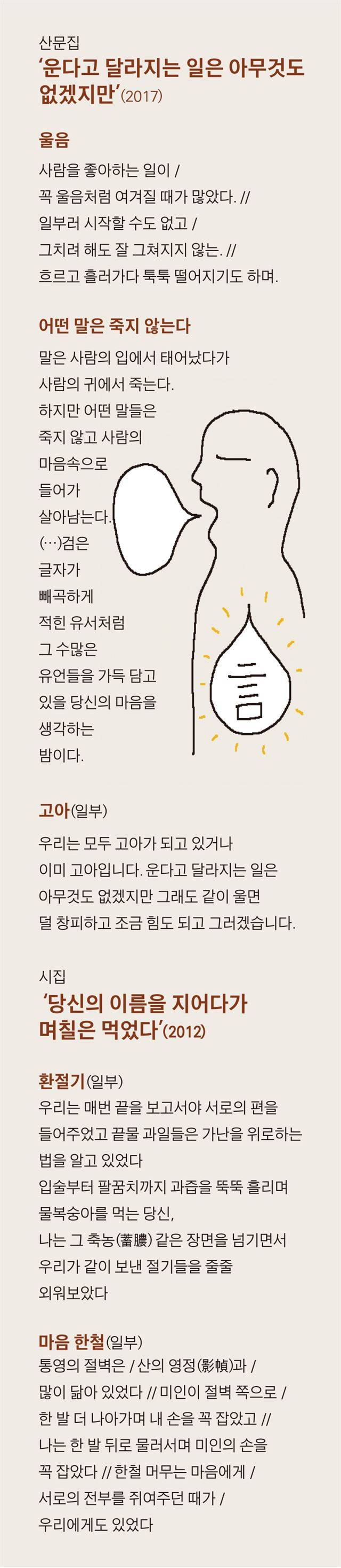 김=“준이 시집을 기다리며 궁금해하는 독자들이 많다는 뜻이죠. 보통 에세이와 달리 시의 호흡으로 만들었어요. 분량이 원고지 400장이 안 돼요. 일부러 텁텁한 종이를 썼고요. 준이 글은 구절구절에 울림이 있어요. 어렵지 않은 단어의 조합이 가볍지 않게 감수성을 건드려요. 슬픔, 이별, 죽음을 얘기하면서도, 사랑과 희망이 있으니 살아가자고 얘기하죠.”
