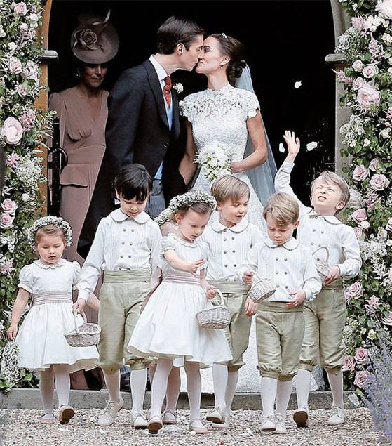 케이트 미들턴 영국 왕세손빈의 여동생 피파가 지난해 5월 결혼식에서 신랑 제임스 매슈스와 키스하고 있다. 미들턴의 아들인 조지 왕자와 딸인 샬럿 공주가 화동으로 나섰다. 미들턴은 아이들을 무척 사랑하는 것으로 알려졌다. [AP=연합뉴스]