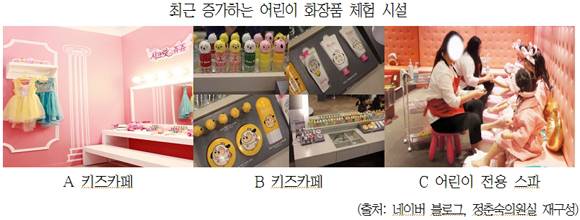 또한 정춘숙 의원에 다르면 변화하는 트렌드에 따라 새로운 어린이 체험시설도 등장하고 있다. 파우더, 립스틱 등 실제 화장품을 발라볼 수 있는 키즈카페와 족욕, 마스크팩, 네일케어 서비스를 받을 수 있는 어린이 전용 스파가 폭발적인 인기를 끌고 있다.