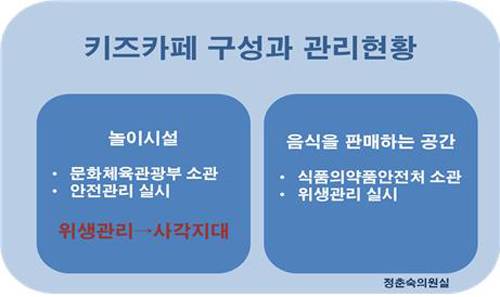 현재 키즈카페는 문화체육관광부와 식품의약품안전처가 나누어 관리한다. 키즈카페 내 음식을 판매하는 식당은 지자체에 일반 또는 휴게음식점으로 신고해 식약처의 위생관리 대상이다. 놀이기구가 위치한 공간은 관광진흥법상 기타유원시설업에 해당해 문체부가 관리를 맡는다.