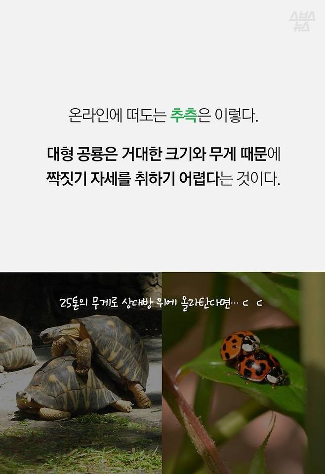 대형 공룡은 거대한 크기와 무게 때문에 짝짓기 자세를 취하기 어려워 멸종했다는 이야기입니다.