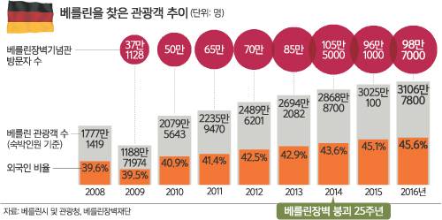 해외 관광객이 많이 찾는 나라와 도시들의 매력포인트는 다양하다. 마주한 순간 감탄사가 절로 나올 수밖에 없는 천혜의 자연경관이나 독특한 양식의 풍경과 고유 문화, 색다른 맛의 음식과 체험 등 보고 즐길 만한 요소가 많을수록 인기가 좋다. 여기에 단순히 보고 즐기는 관광을 넘어 지적 욕구까지 채울 수 있다면 ‘가고 싶은 1순위 관광지’로 손색이 없다. 그런 면에서 독일 베를린은 세계적으로 관광 경쟁력이 센 도시다. 제2차 세계대전과 유대인 대학살(홀로코스트)을 저지른 나치 독재정권의 심장부였으며, 종전 후 동서냉전과 동서독 분단의 살벌함을 오랫동안 직면했던 도시의 역사적인 강렬함 때문이다. 독일 연방정부와 베를린시가 ‘불편한 역사’의 흔적들을 관광상품화하지 않았지만 베를린이 유럽에서 손꼽히는 관광지가 된 것도 이와 무관치 않다. 2016년 기준 베를린을 찾은 국내외 관광객은 3106만여명(숙박인원 기준)으로 이 중 외국인 비율이 45.6%다.