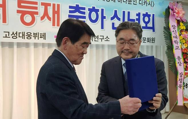 | ▲ 1일 저녁 고성 대웅예식장뷔페에서 열린 ‘검정 중고등학교 국어교과서 디카시 수록 축하 신년인사회'에서 도충홍 고성문화원장이 김종회 교수한테 공로패를 전달하고 있다. |