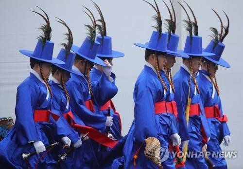 (강릉=연합뉴스) 김주성 기자 = 평창동계올림픽이 열리는 강원 평창과 강릉 일대 기온이 크게 떨어진 4일 오전 강릉선수촌에서 취타대가 입촌식 예행연습을 하고 있다. 2018.2.4