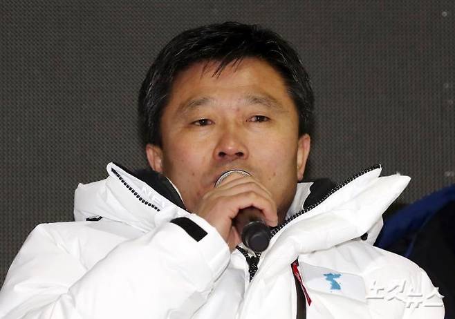 박철호 여자아이스하키 북한 감독이 4일 오후 인천선학국제빙상장에서 열린 여자아이스하키 국가대표 평가전 남북단일팀과 스웨덴의 경기를 마치고 열린 기자회견에서 각오를 밝히고 있다.