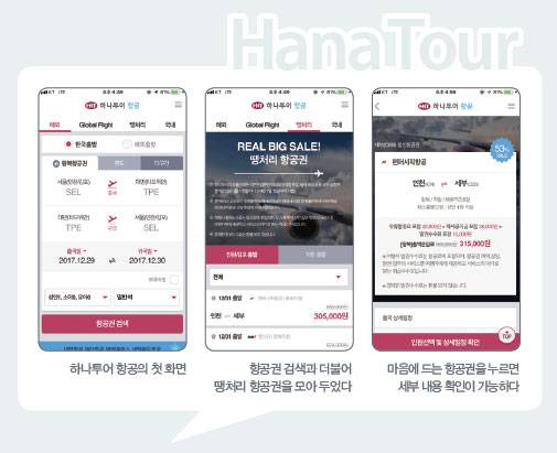 하나투어 앱 중에서도 오직 항공권만을 위해 만들어진 앱이다. 첫 화면에서 출발·도착 날짜, 목적지를 검색하는 방식은 평범하지만, ‘땡처리’ 메뉴는 눈여겨볼 만하다. 마음에 드는 특가를 골라 들어가면 인원 선택 및 상세 일정 확인이 가능하고, 그 다음 예약하기로 진행된다. 항공권 가격은 유류할증료, 제세공과금 등을 모두 포함한 총액운임이며, 결제된 ‘발권수수료’는 환불되지 않는다. 땡처리 상품들을 여행지나 가격 순 등으로 필터링할 수 없다는 점이 좀 아쉽지만, 인천·김포 출발과 지방 출발 두 가지 섹션으로 나누어 항공권을 나열해 놓은 점은 플러스 요인이다.