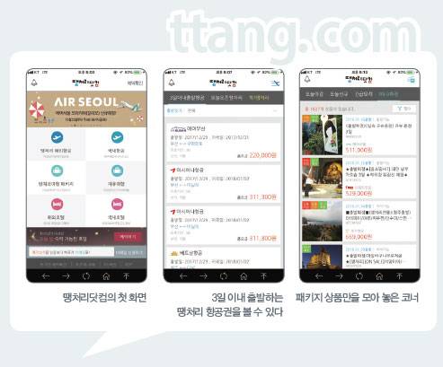 한 번쯤은 들어 봤을 거라 확신한다. 땡처리계(?)의 1번지와 같은 서비스다. 당장 내일이라도 떠날 마음이 있다면 ‘땡처리 해외 항공’ 메뉴의 ‘3일 이내 출발 항공’에 들어가 보자. 말 그대로 3일 이내 출발하는 항공편을 확인할 수 있고, 오른쪽 메뉴 바에서 원하는 목적지를 선택해 항공권 목록을 나열시킬 수도 있다. 다른 앱들과는 다르게 패키지 상품만을 모아 놓은 코너도 있다. ‘땡처리여행 패키지’ 메뉴에 가면 ‘오늘마감’, ‘오늘신규’, ‘긴급모객’, ‘99.9확정’ 등 항공은 물론 숙박, 여행코스, 체험 등을 두루 포함한 패키지 상품을 볼 수 있다. 다만, 즐겨찾기 기능이 있으면 더 좋았을 걸.