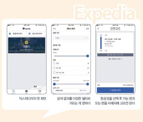 출발지와 도착지, 여행기간을 입력한 뒤 검색을 누르면 결과 목록이 쫙 뜨는 것은 스카이스캐너와 비슷하지만, ‘즉시 예약’이 된다는 차별점이 있다. 항공권 대기 예약 상태로 기다릴 필요 없이 결제하는 순간 예약이 100% 확정되는 것. 차근차근 순서를 밟아 나가는 화면 구성도 깔끔하다. 항공사를 선택하고, 가는 편과 오는 편을 고른 뒤 결제 화면으로 넘어가며 직항 여부, 비행시간, 항공사 등 필요에 따라 필터로 걸러 내는 기능이 있다. 호텔도 예약할 수 있지만 안타깝게도 카드사 할인 혜택은 없다. 페이스북 계정을 연동해 정보를 공유할 수 있다.