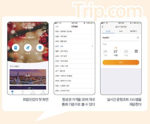 중국계 온라인 여행사인 씨트립Ctrip이 대륙의 힘을 전 세계로 뻗치고 있다. 작년 11월 ‘트립닷컴’으로 브랜드명을 바꾸며, 글로벌화를 선언한 것. ‘글로벌’이라는 타이틀에 맞게 트립닷컴은 13개국 언어를 지원하며, 모바일 화면 오른쪽 위에 있는 ‘통화 변경’을 누르면 20여 개국 통화로 항공권 가격을 조회할 수 있다. 트립닷컴의 또 하나의 강점은 ‘실시간 운항조회’로 항공편에 대한 실시간 정보를 확인할 수 있다는 점. 해당 항공편명을 입력하면 여행 당일 지연 및 결항 소식까지 꼼꼼하게 체크해 준다. 호텔과 기차표 예약 서비스도 지원하지만, 기차의 경우 아직은 중화권에 특화돼 있다.