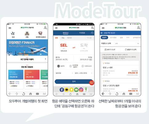 여러 사람이 하나의 물건을 동시 구매함으로써 저렴한 가격에 거래가 가능한 공동구매. 일명 ‘공구’로 불리는 이 쏠쏠한 지름이 항공권에도 적용된다. 모두투어 개별여행 앱의 왼쪽 메뉴 바에서 ‘공동구매 항공권’ 목록으로 들어가면 대륙과 나라별로 ‘공구’할 수 있는 항공권이 쫘르르 뜬다. 목록은 선택된 날짜로부터 1개월 이내의 항공편 기준으로 검색된다. 항공권을 클릭해 유효기간과 좌석, 최소 출발인원 등 정보를 확인한 후 하단에 있는 ‘예약하기’ 버튼을 누르고 기다리면 끝. 공동구매의 특성상 예약이 조기 마감되는 등 제약사항이 있을 수 있으니, 추후 예약 확정 여부를 확인해야 한다.